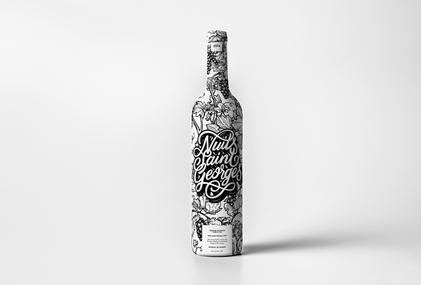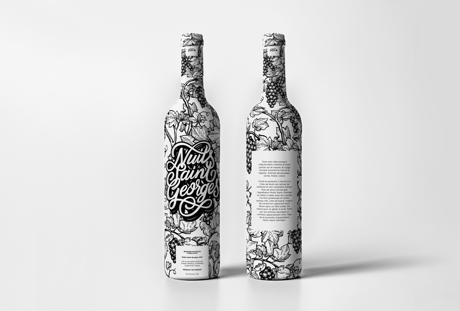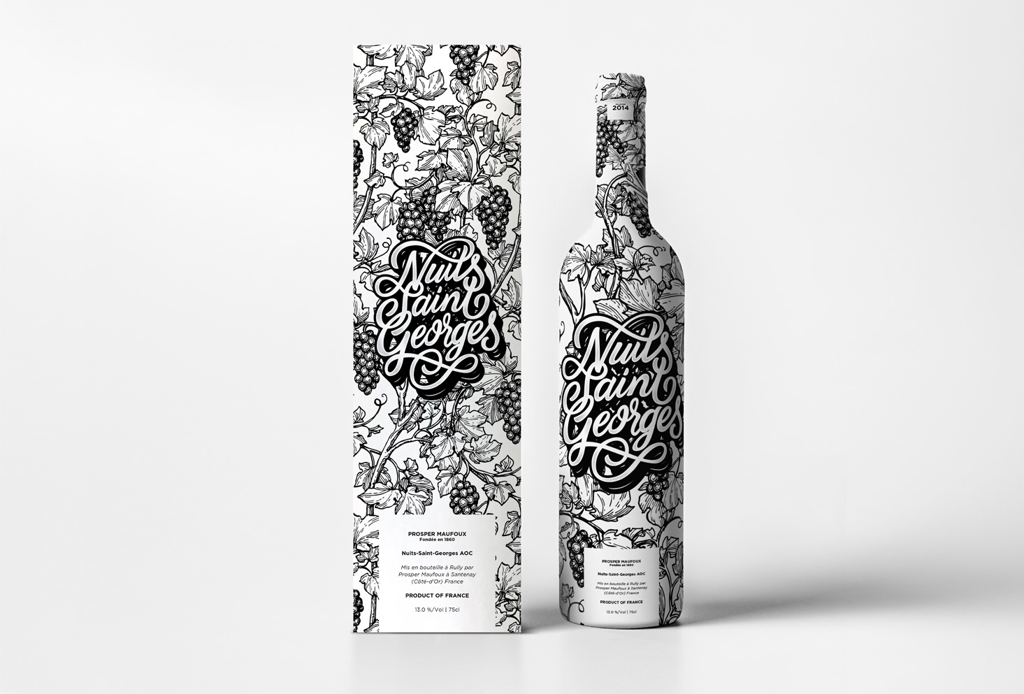 Réalisation d'un packaging pour le vin Nuit-Saint-Georges de la maison Prosper Maufoux en Bourgogne. Creation of a packaging for the Nuit-Saint-Georges wine of the Prosper Maufoux house in Burgundy.